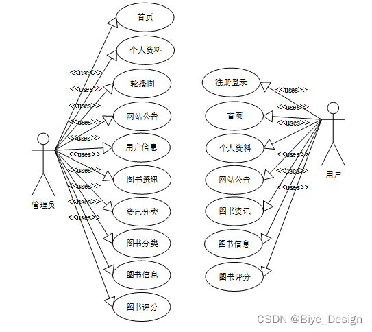 图书推荐系统的功能主要分为前台用户根据自己的需求进行注册登录,浏览图书信息并对选中的图书进行评分操作。后台系统管理员因职责的不同,管理员主要对图书进行分类,对注册用户管理,图书信息管理,图书评分等进行处理。