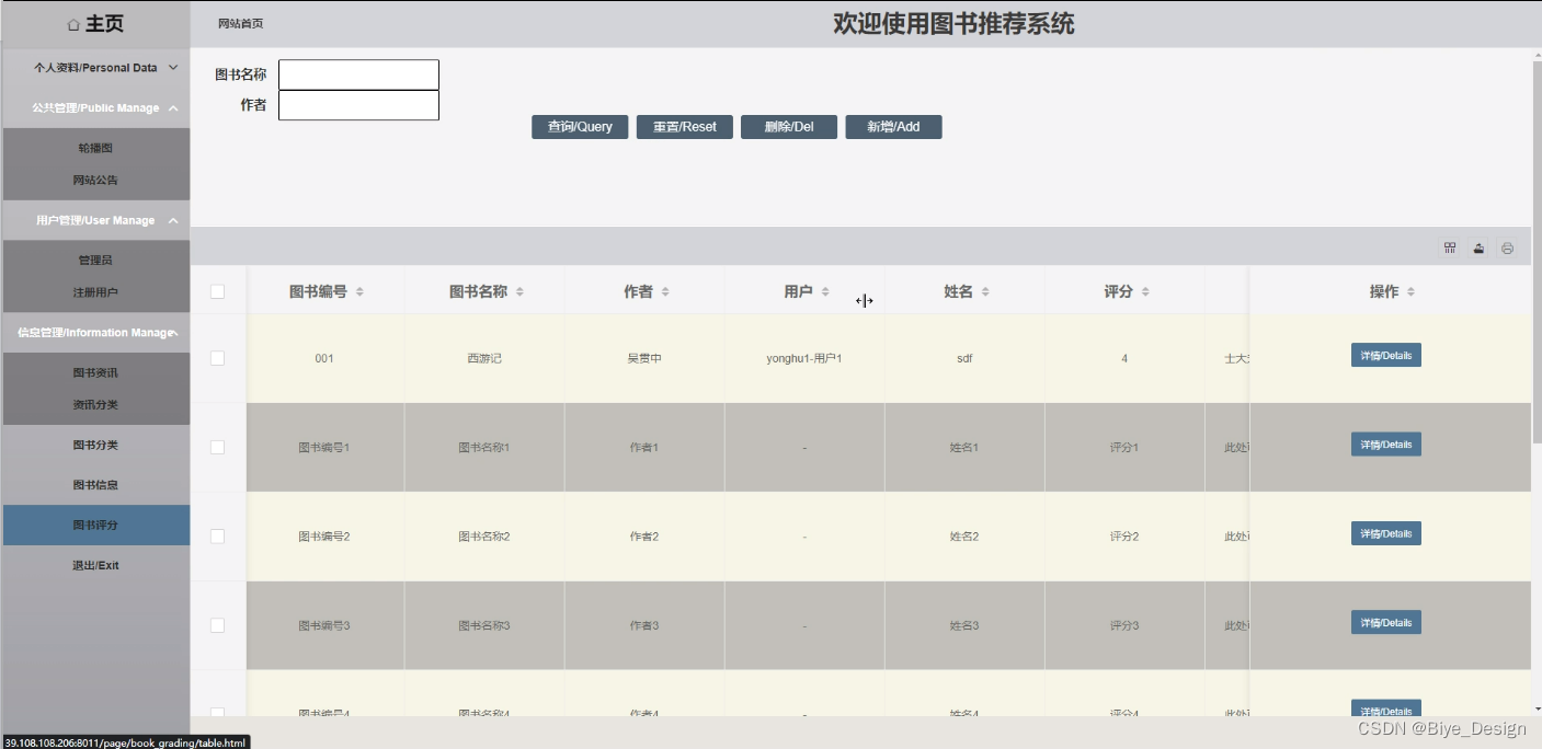 图书推荐系统的开发是以Django框架作为基础,系统整体为B/S架构,数据库系统使用MySQL。文中详细分析了图书推荐系统的研究背景、研究目的和意义、开发工具和相关技术以及系统需求、系统详细设计和系统测试等等一系列内容。系统实现了图书推荐系统所需的一些基本功能,并通过测试对这些实现的功能进行了完善,进而提高了系统整体的实用性。系统投入运行时,各功能均运行正常。系统的每个界面的操作符合常规逻辑,对使用者来说操作简单,界面友好。整个系统的各个功能设计合理,体现了人性化。