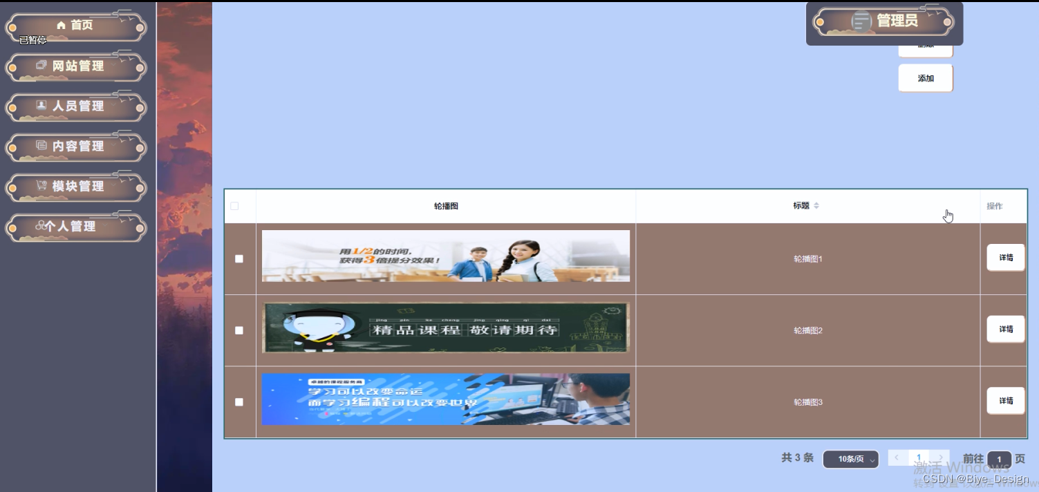(1)网站管理:管理员可以对学生用户端展示的轮播图以及公告进行增删改查,方便用户进行查看。