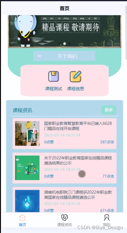 (4)课程资讯:当用户点击“课程资讯”这一菜单按钮,会显示管理员在后台发布的所有的课程资讯,可以查看详情,进行收藏、点赞、评论等;