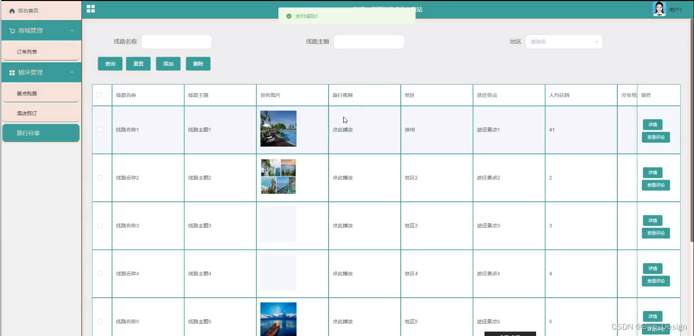 旅行分享管理,在旅行分享页面可以查看线路名称、线路主题、宣传图片、旅行视频、地区、人均花销、途径景点、分享用户、交通安排、时间安排线路介绍等内容,并可根据需要进行查看评论、添加或删除操作,如图5-8所示。