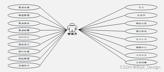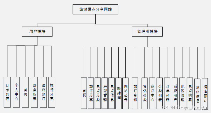 旅游景点分享网站基于现有的手机,可以实现管理员:首页、轮播图(轮播图管理)、网站公告管理(网站公告)、资源管理(旅行资讯、资讯分类)、商城管理(商品中心、分类列表、订单列表)、系统用户(管理员、注册用户)、模块管理(地区管理、景点分类、房型管理、景点信息、景点购票、酒店信息、酒店预订、旅行分享)等详细的了解及统计分析。根据系统功能需求建立的模块关系图如下图: