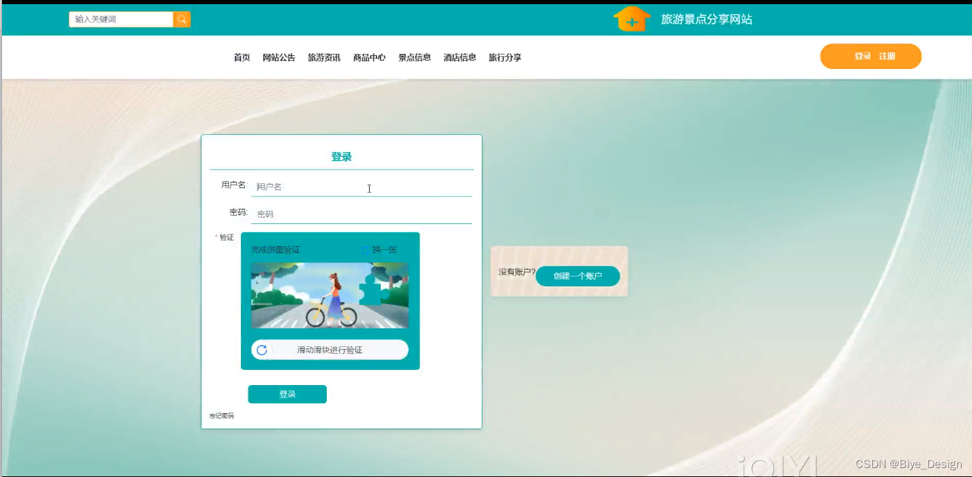 旅游景点分享网站登录界面,通过填写账号、密码、滑动滑块进程验证进行登录,如图5-1所示。