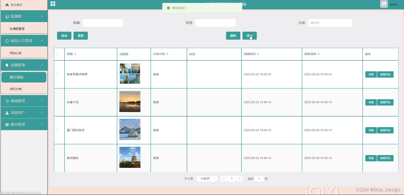 旅行资讯管理,在旅行资讯页面可以查看标题、封面图、文章分类、标签等内容,并可根据需要进行查看评论、添加、修改或删除操作,如图5-13所示。