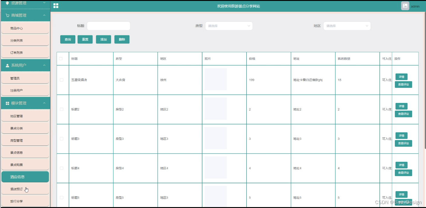 酒店信息管理,在酒店信息管理页面可以查看标题、房型、地区、照片、价格、地址、客房数量、可入住人数、房间设施等内容,并可根据需要进行查看评论、添加、修改或删除操作,如图5-15所示。