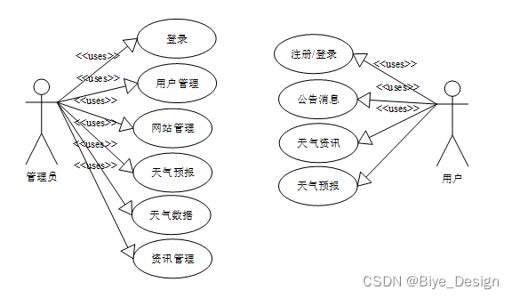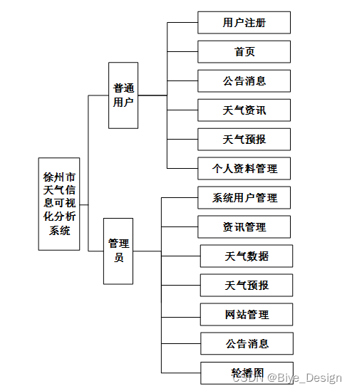 天气信息可视化分析系统的功能主要分为前台用户根据自己的需求进行注册登录,浏览天气信息并对选中的天气进行搜索操作。后台系统管理员因职责的不同,管理员主要对注册用户,天气预报、天气数据进行处理。