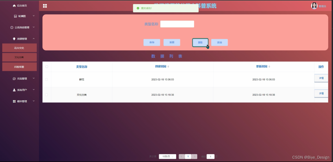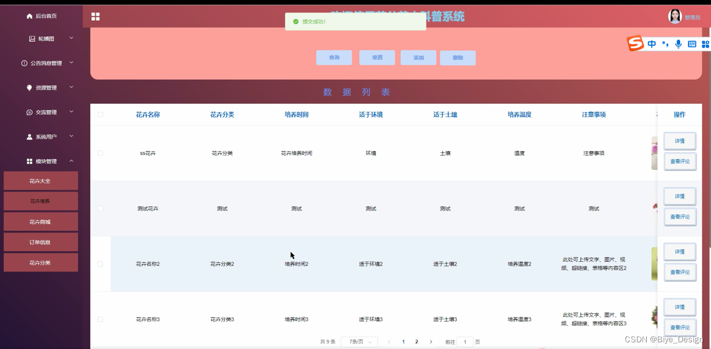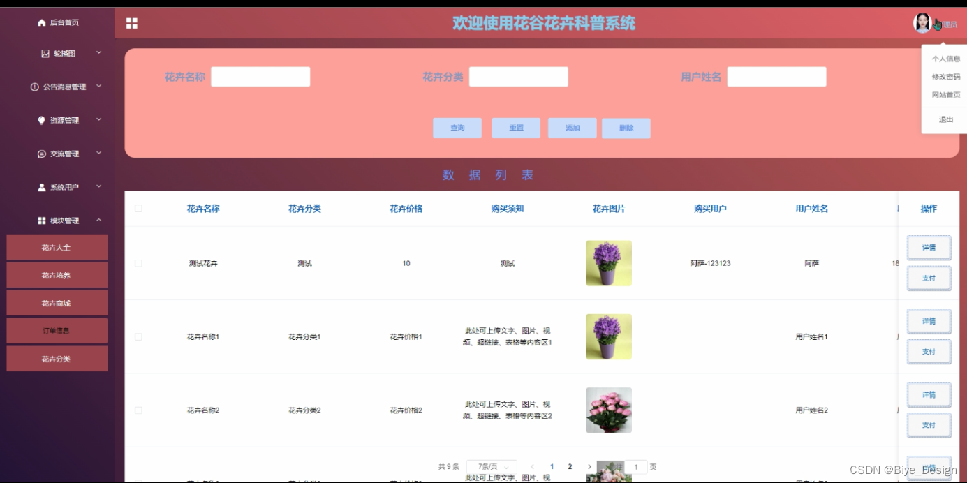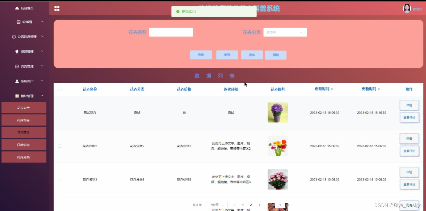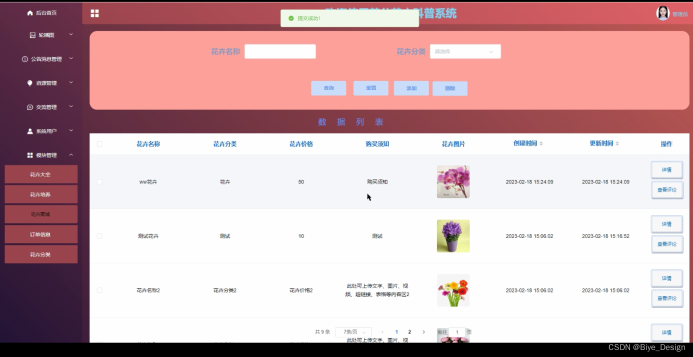 模块包括系统首页、轮播图、公告消息、资源管理(花卉文化、文化分类、问卷答题)交流管理(交流论坛、论坛分类)系统用户(管理员、普通用户)模块管理(花卉大全、花卉培养、花卉商城、订单信息、花卉分类)等进行相应的操作。