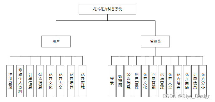 这些功能可以充分满足花谷花卉科普系统的需求。此系统功能较为全面如下图系统功能结构如图4-3所示。