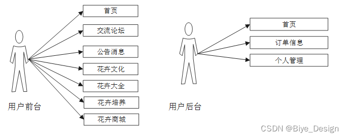 用户分前台和后台功能 前台和后台,可以实现网站首页、交流论坛、问卷答题、公告消息、花卉文化、花卉大全、花卉培养、花卉商城等功能;后台功能分:首页、订单信息。例如图3-2所示。