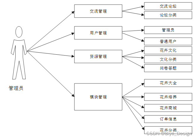 管理员登录后可对系统首页、轮播图、公告消息、资源管理(花卉文化、文化分类、问卷答题)交流管理(交流论坛、论坛分类)系统用户(管理员、普通用户)模块管理(花卉大全、花卉培养、花卉商城、订单信息、花卉分类)等进行管理,管理员用户的用例如图3-1所示。