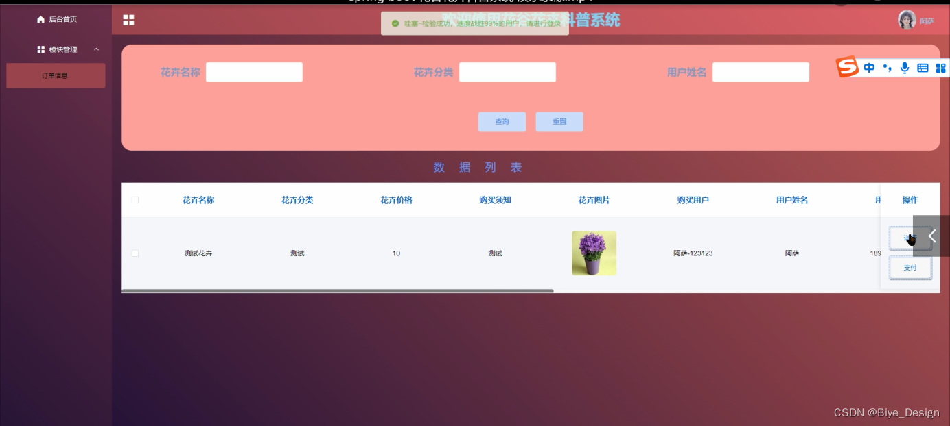 订单信息管理,在订单信息管理界面可查询花卉名称、花卉分类、花卉价格、购买须知、花卉图片、购买用户、用户姓名、收货地址、购买数量、购买金额等信息查看或支付,对已有的订单信息进行修改或删除操作,如图5-10所示。