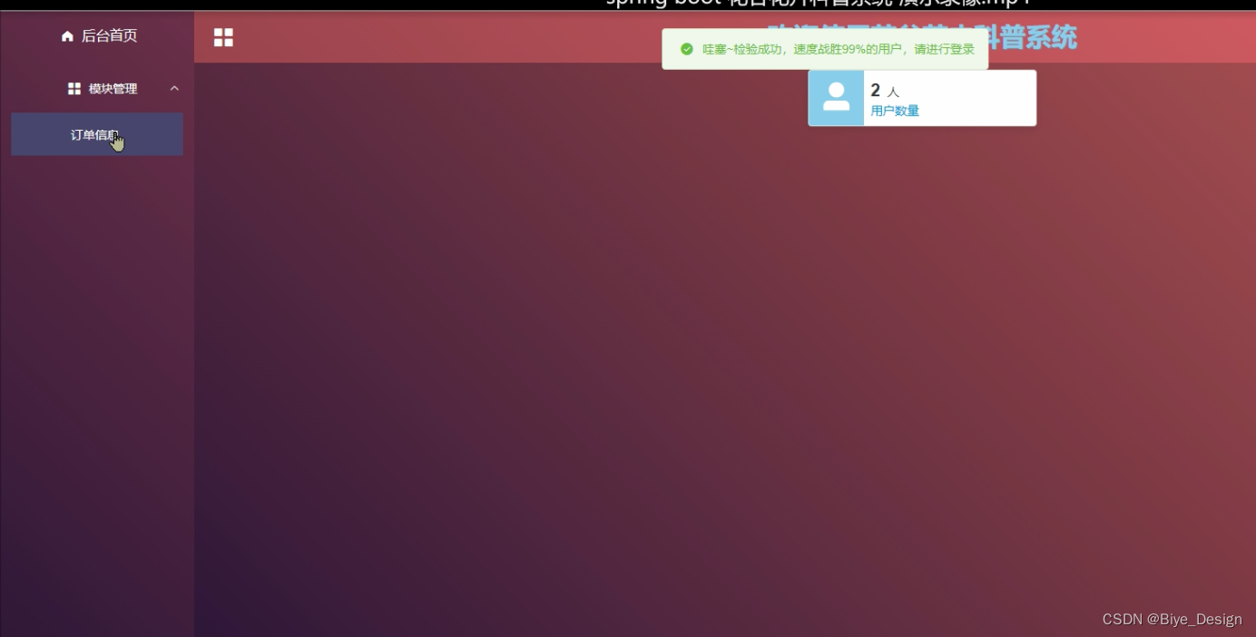 用户点击后台进入到系统操作界面,可以浏览首页、订单信息等功能,如图5-9所示。