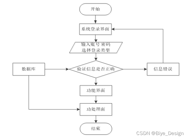 用户想进入系统,首先进入系统登录界面,通过正确的用户名、密码,选择登录类型登录,系统会检查登录信息,信息正确,然后输入相应的功能界面,提示信息错误,登录失败。系统操作流程如图3-4所示。