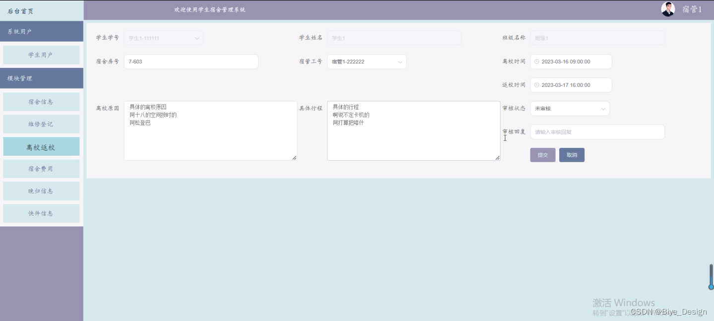 离校返校:宿管用户可在此页面查看学生申请的离校返校信息,如:宿舍房号、学生学号、学生姓名、班级名称、宿管工号、离校时间、返校时间、离校原因、具体行程等详细信息,并进行审核回复操作,如图5-15所示。