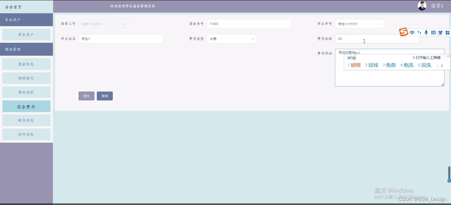 宿舍费用:宿管用户可在此页面查看学生宿舍的费用信息,如:宿舍房号、学生学号、学生姓名、宿管工号、费用金额、费用类型、费用明细等详细信息,并可进行增删改查等操作,如图5-16所示。