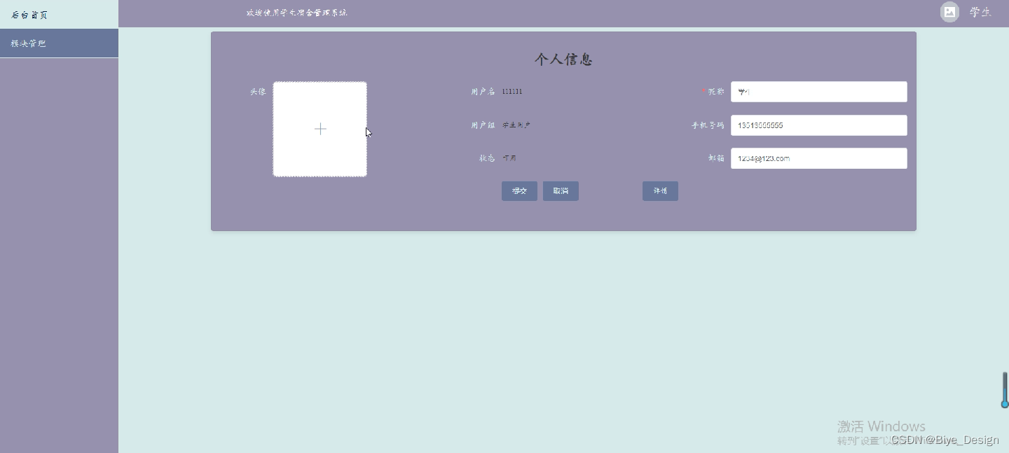 个人信息,在该页面可以查看用户名、用户组、状态等信息,可对昵称、手机号、邮箱和头像进行更改,如图5-7所示。