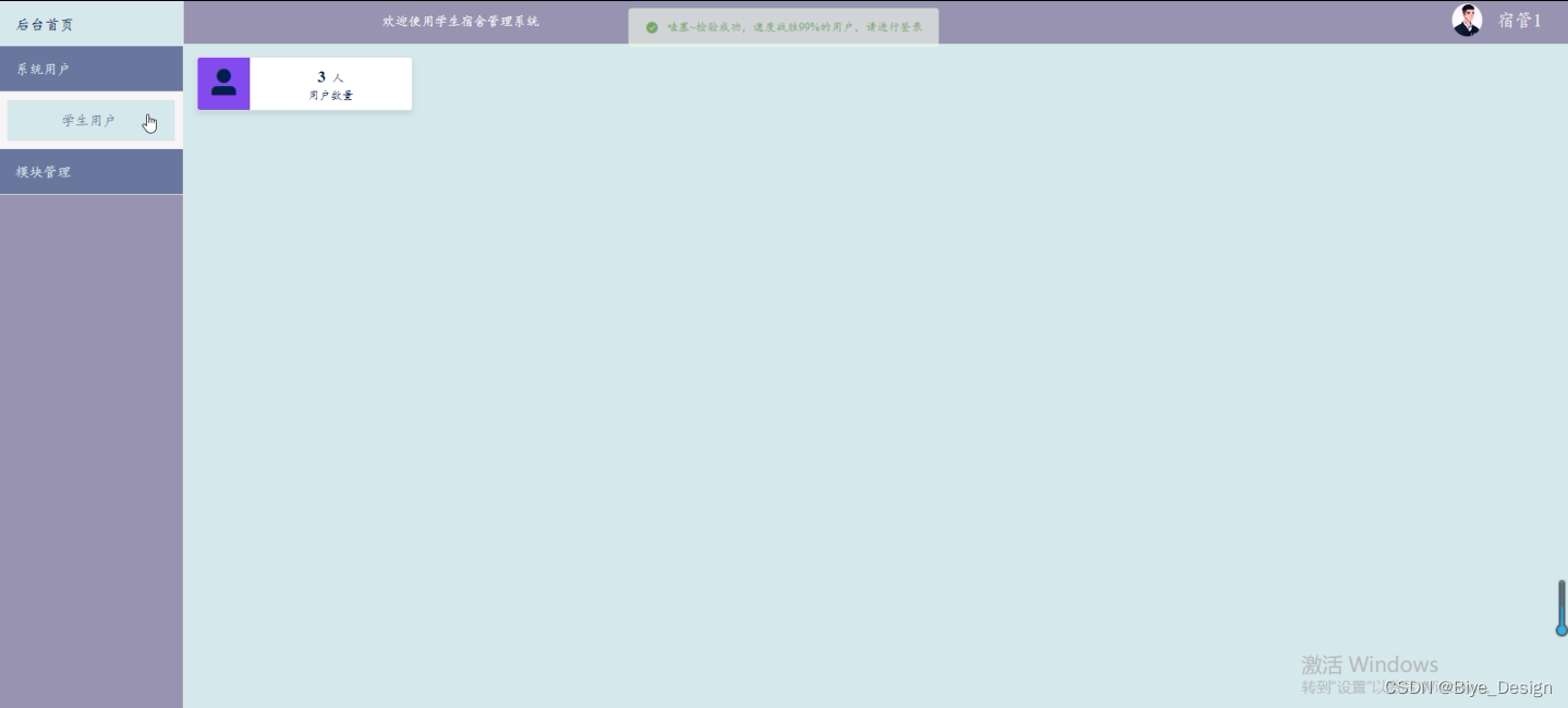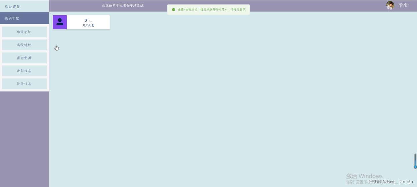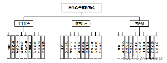 (1)功能要求:后台首页,系统用户(管理员、学生用户、宿管用户)模块管理(宿舍信息、维修登记、离校返校、宿舍费用、晚归信息、快件信息)个人信息等功能模块。