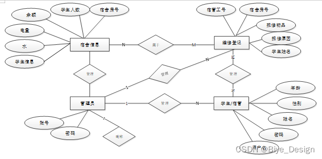 通过学生宿舍管理系统的功能进行规划分成几个实体信息,实体信息将通过ER图进行说明,本系统的主要实体图如下: