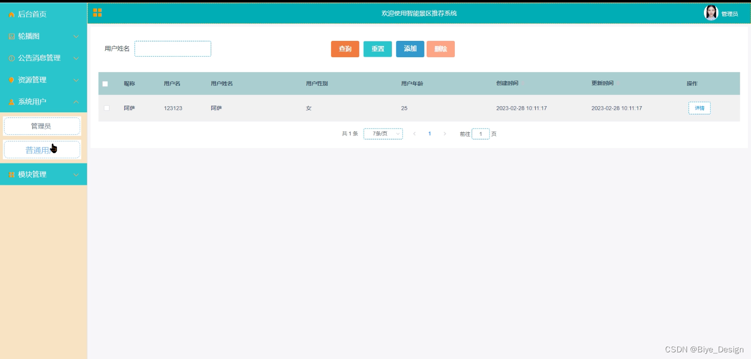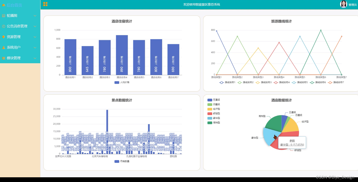 该系统实现了智能景区推荐管理内部的各种工作流程计算机管理化,其中包括管理员的系统首页、轮播图、公告消息、资源管理(旅游资讯、资讯分类)系统用户(管理员、普通用户)模块管理(旅游景区、酒店住宿、旅游路线、景区分类、景点数据、酒店数据)等功能。