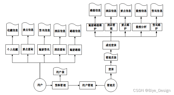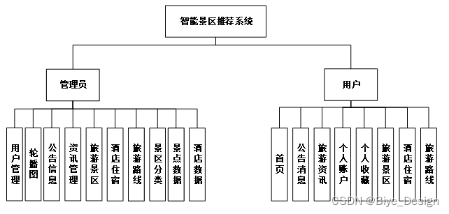 根据对系统的功能进行分析可以总结智能景区推荐系统的具体功能模块包括下面的几个主要的功能模块:该系统主要从两大模块进行设计的,首先就是用户参与操作需要的模块,此外还需要有管理员用到的模块,两者之间不是互相独立的,他们之间有着密切的联系,同数据库表中的数据连接起来进行操作。每个模块访问相同的数据库,但访问的表不同。系统的各个功能模块是根据所收集的资料研究得到的。在以上分析功能的基础上,系统模块分为多个模块。用户含有的功能有首页、公告消息、旅游资讯、个人账户、个人收藏、旅游景区、酒店住宿、旅游路线等,退出登录等功能,管理员含有的功能有修改密码,用户管理、景点管理、景点类型、酒店信息、旅游路线、数据分析等功能。