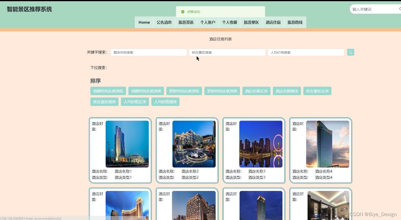 酒店信息模块:从管理员发布的酒店信息数据中选择要查询的酒店信息进行查看或点赞收藏。