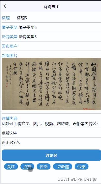 (3)诗词圈子:用户可以查看诗词圈子,在查询到自己想要了解的诗词圈子的时候,可以进入查看详细的介绍,点击“关注粉丝”这一按钮以后会跳转到关注粉丝信息填写的界面,根据提示填写好关注粉丝的信息,点击“提交”以后关注粉丝就完成了,在诗词圈子详情这个界面,同时支持用户对喜欢的诗词进行收藏、点赞、评论、分享的功能。