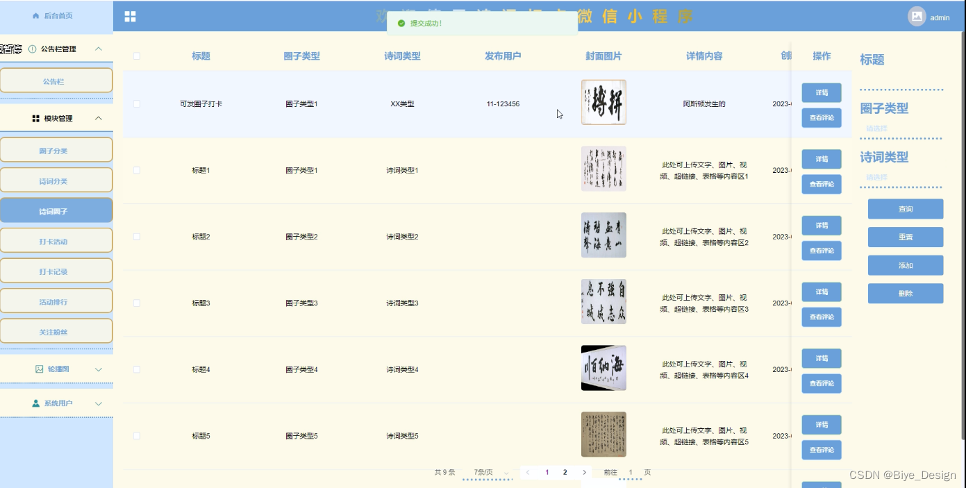 (4)诗词圈子:管理员点击“诗词圈子”会显示出所有的诗词圈子信息,支持输入标题或者圈子类型对诗词圈子信息进行查询,如果想要添加新的诗词圈子信息,点击“添加”按钮,输入标题、圈子类型、诗词类型、发布用户、封面图片、详情内容等信息,点击“提交”按钮就可以添加了,同时可以选择某一条诗词圈子信息,点击“删除”进行删除,也可以对用户提交的诗词圈子评论的信息进行管控;