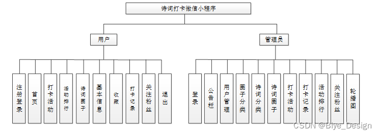 诗词打卡微信小程序划分为了普通用户模块和管理员模块这两大部分。