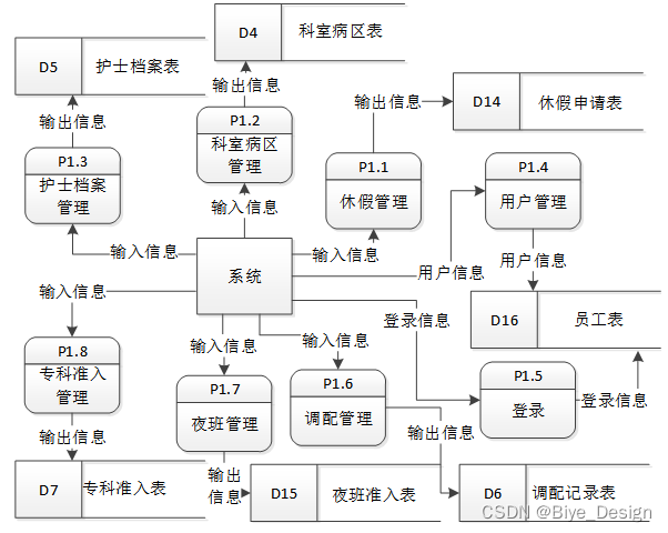 二层数据流程是对一层数据流层图中填写登录信息、用户功能的细化。即:填写登录信息细化为填制信息、后台审核,用户功能细化为科室病区管理、部门管理、用户管理、科室病区管理、通知公告管理、工资管理、请假管理、权限管理管理、休假申请管理、用户打卡管理、投诉建议管理、请假统计等操作。