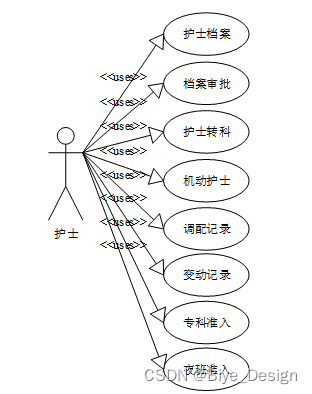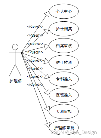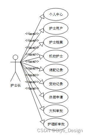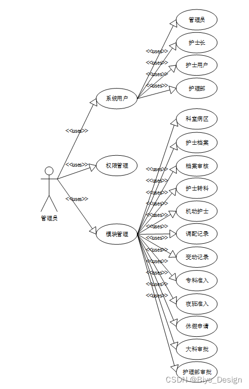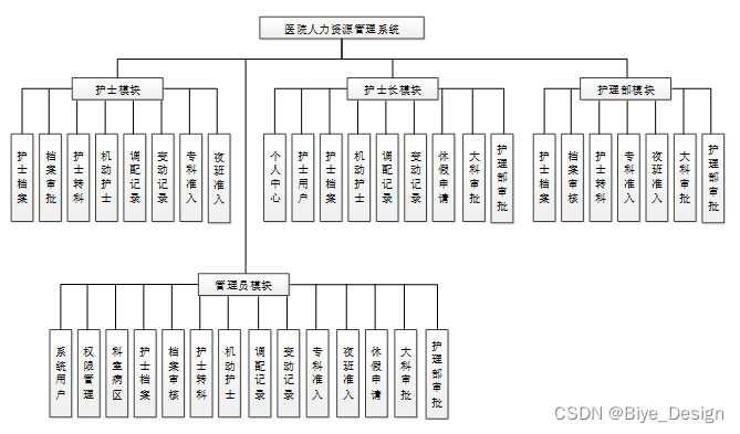 医院人力资源管理系统在对需求做解析后,整个系统主要分为用户和管理员两个模块,往下细分为四个角色:管理员和护士、护士长以及护理部,每个模块下的分支功能不一样。对功能做出如下说明: