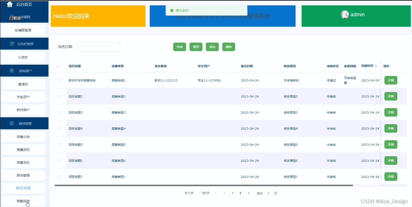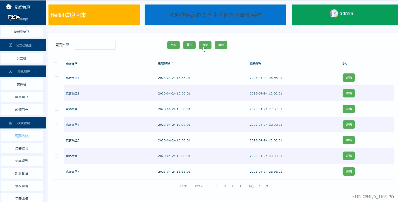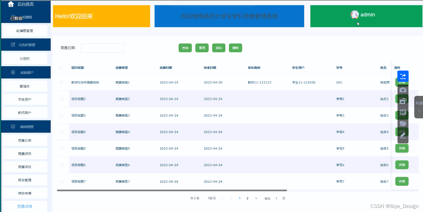 (2)高校大学生学科竞赛管理系统中的web后台管理中的前端使用的是bootstrap框架,它配合ajax和jquery可以美化页面设计。