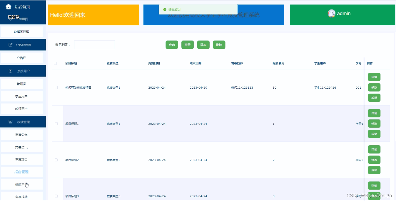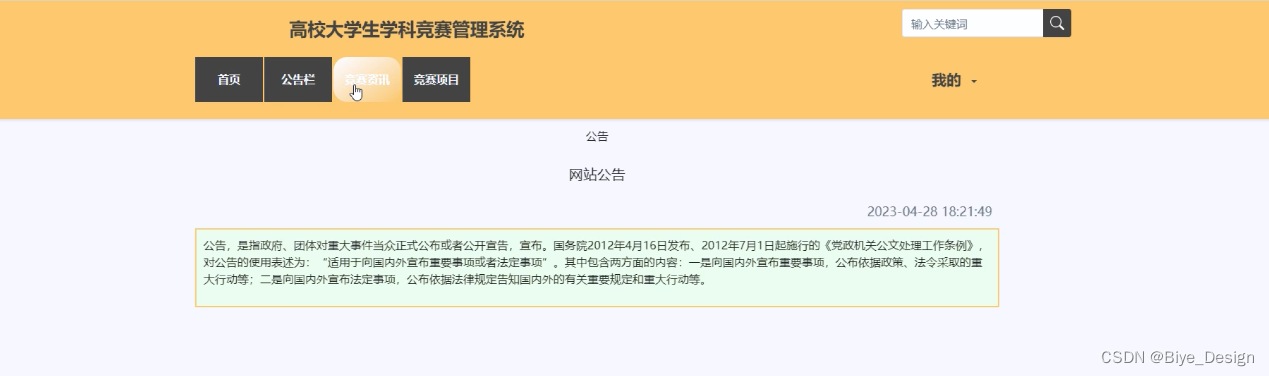 This design mainly implements a university student subject competition management system that combines the advantages of humanization, efficiency, and convenience. It completes functional modules such as competition classification, competition information, competition projects, registration management, modification of applications, and competition scores. The system communicates with the server through a browser to achieve data interaction and changes. You only need to use a computer and move your fingers to operate the system, achieving data communication management. The entire system design process fully considers issues such as data security, stability, and reliability, and the operation process is simple. This system improves work efficiency and reduces errors and omissions in data storage through scientific management and convenient services.