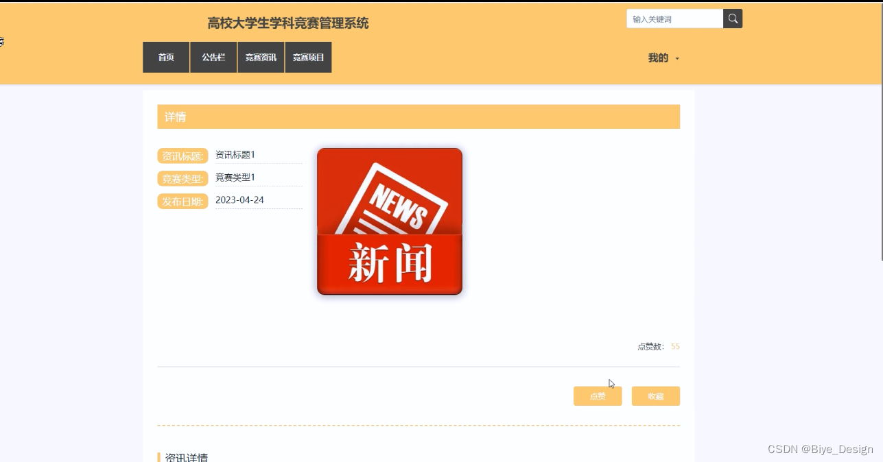 (6)竞赛项目:学生可以查看竞赛项目,在查询到自己想要了解的竞赛项目的时候,可以进入查看详细的介绍,点击“报名”这一按钮以后会跳转到报名信息填写的界面,根据提示填写好报名的信息,点击“提交”以后报名就完成了,在竞赛项目详情这个界面,同时支持用户对喜欢的竞赛项目进行收藏、点赞的功能。