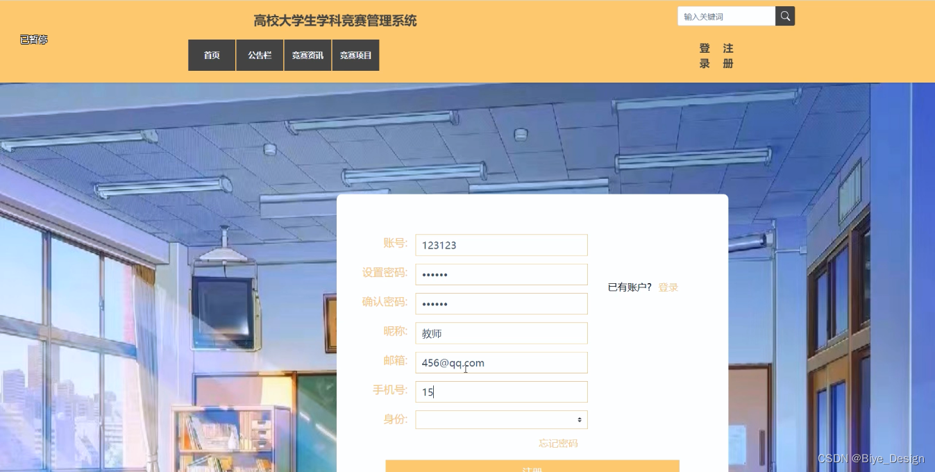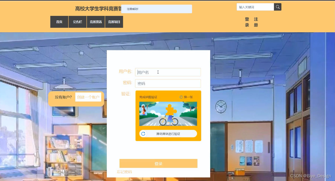 (1)用户注册登录:游客可以随时进入到系统中,对系统中的信息浏览,但是想要实现竞赛项目等操作,就必须有这个系统的账号,如果没有账号的话,可以注册以后进行相关的操作,同时用户还可以通过“我的账户”这以按钮对个人信息以及操作的信息进行管控。