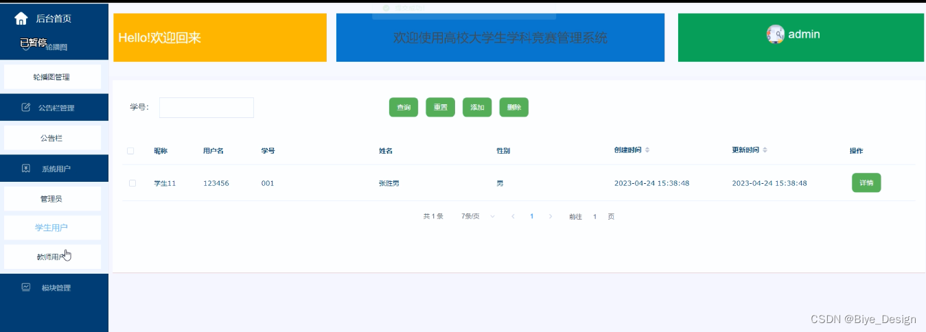 (4)系统用户:管理员点击“系统用户”菜单可以对系统中存在的用户进行管理,包含了管理员用户、竞赛项目用户和学生用户。
