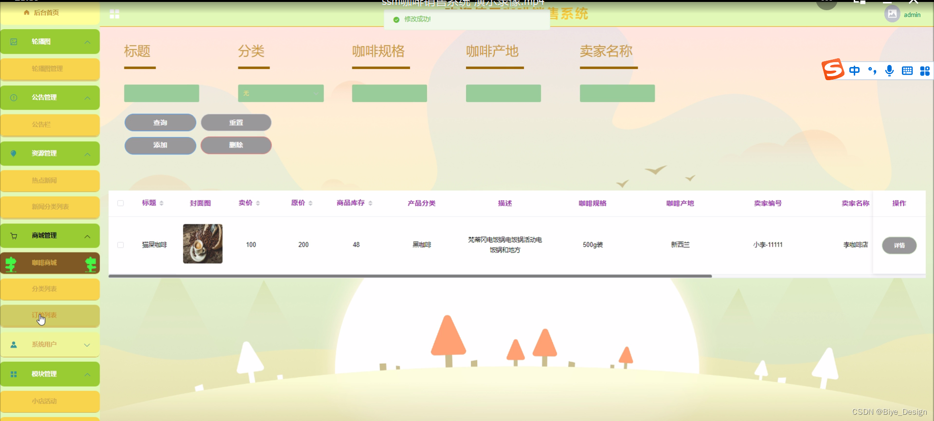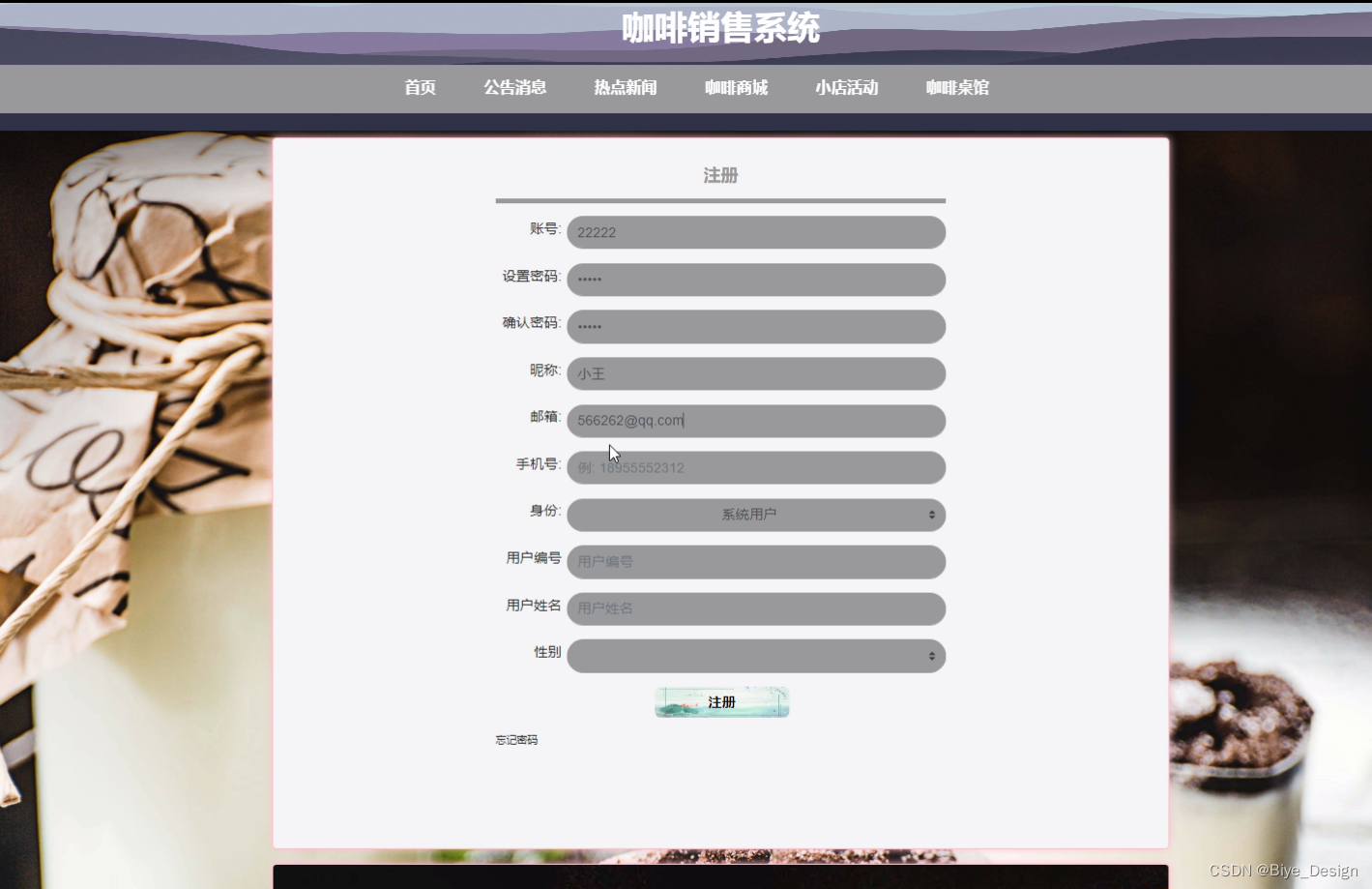 The coffee sales system is based on the SSM development platform, uses Java programming language, MVVM mode and other technologies, and uses MySQL database to establish data conversion. It mainly realizes the functions of registration, login, commodity information query, commodity transaction, checkout, order management, etc. It establishes a set of scientific and effective management processes for buyers and sellers, reduces mistakes in traditional commodity sales, and also facilitates people's shopping. The system interface is simple, users can quickly grasp, effectively improve the efficiency.