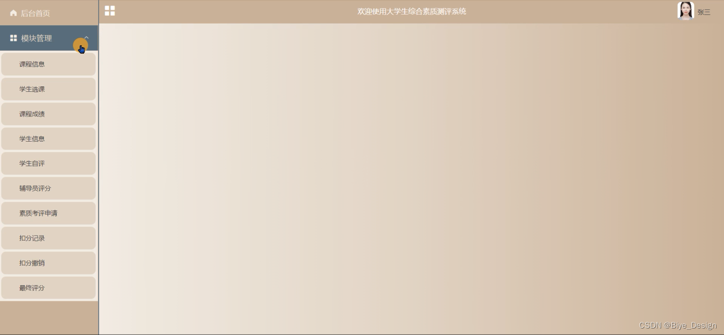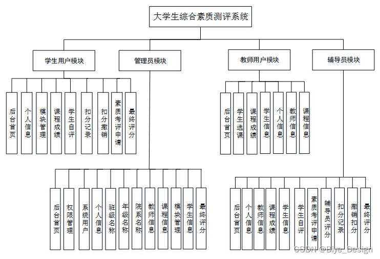 (1)功能要求:后台首页,系统用户(管理员、学生用户、教师用户、辅导员)权限管理、模块管理(年级名称、班级名称、院系名称、教师信息、课程信息、学生选课、课程成绩、学生信息、学生自评、辅导员评分、素质考评申请、扣分记录)个人信息等功能模块。