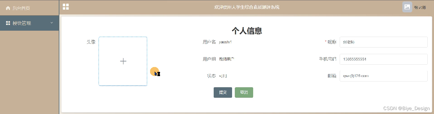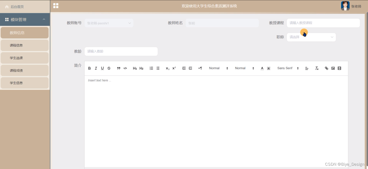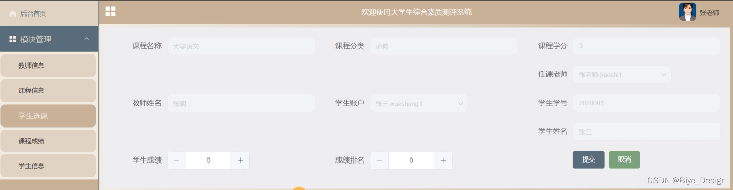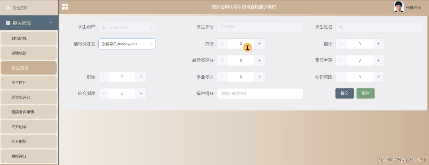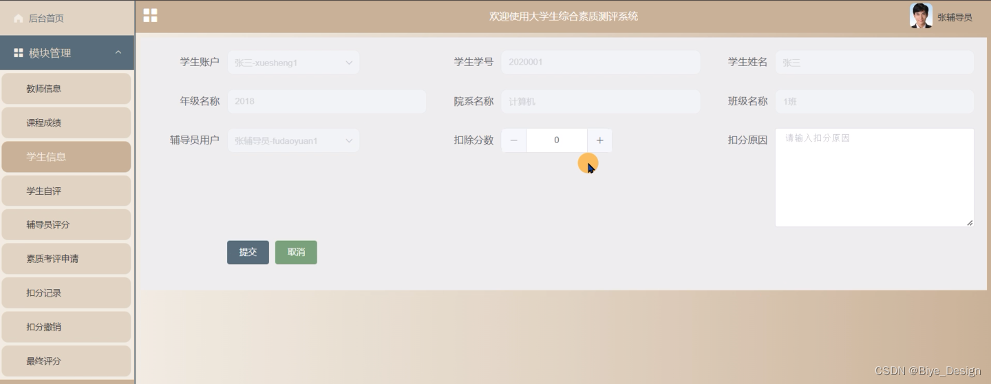 3、功能的完善性:拥有后台首页,系统用户(管理员、学生用户、教师用户、辅导员)权限管理、模块管理(年级名称、班级名称、院系名称、教师信息、课程信息、学生选课、课程成绩、学生信息、学生自评、辅导员评分、素质考评申请、扣分记录)个人信息等功能的修改维护操作。