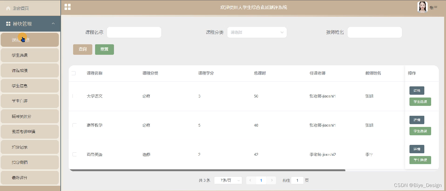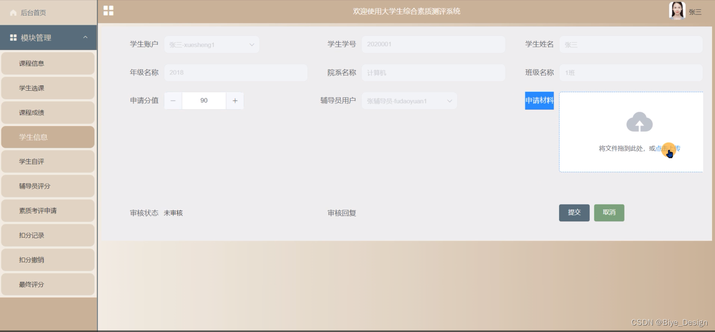 目前许多人仍将传统的单机设备作为信息管理的主要工具,而网络技术的应用只是起到辅助作用。在对网络工具的认知程度上,较为传统的office软件等仍是人们使用的主要工具,而面向各个专门行业的管理系统的信息管理软件仍然缺乏群众基础。本选题则旨在通过标签分类管理等方式,实现系统后台首页,系统用户(管理员、学生用户、教师用户、辅导员)权限管理、模块管理(年级名称、班级名称、院系名称、教程信息、课程信息、学生选课、课程成绩、学生信息、学生自评、辅导员评分、素质考评申请、扣分记录、扣分撤销、最终评分)个人信息等功能。