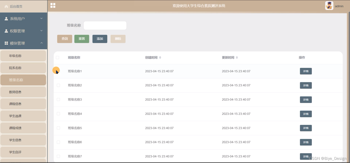 班级名称:管理员在此页面可以添加班级名称进行管理,可根据里进行详情、删除、查询等操作,如图5-5所示。