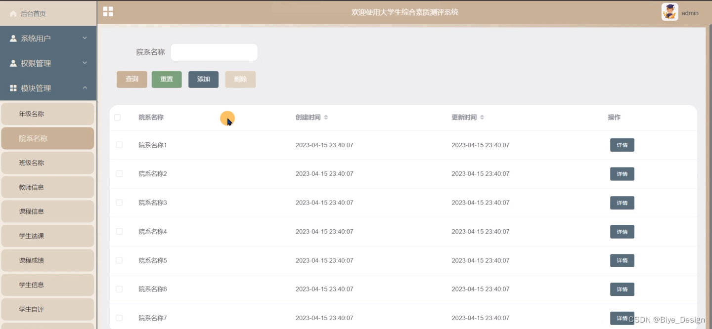 院系名称:管理员在此页面可以添加院系名称进行管理,可根据里进行详情、删除、查询等操作,如图5-6所示。