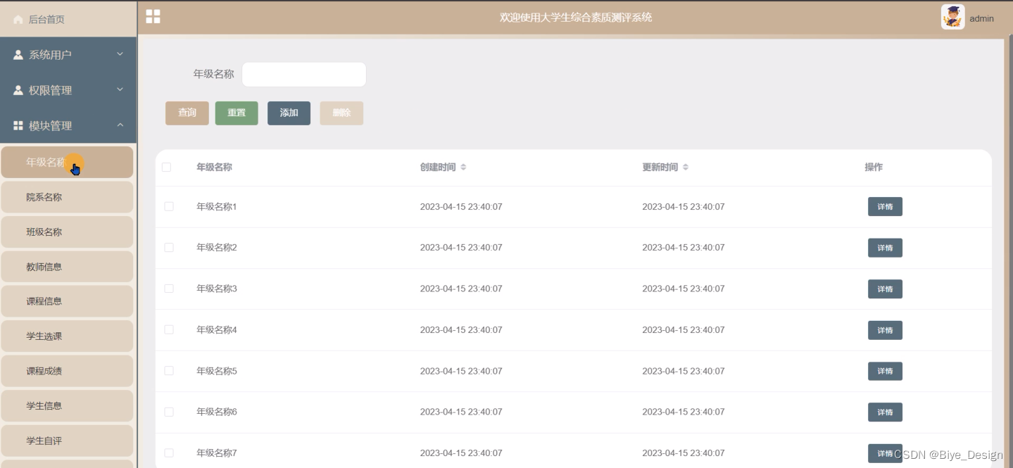年级名称:管理员在此页面可以添加年级名称进行管理,可根据里进行详情、删除、查询等操作,如图5-6所示。