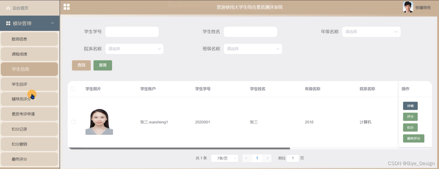 学生信息,辅导员在此页面可查看学生照片、学生用户、学生学号、学生姓名、年级名称、院系名称、班级名称等详细信息,可根据需要进行详情、评分、扣分、最终评分等操作,如图5-19 5-20 5-21 5-22所示。
