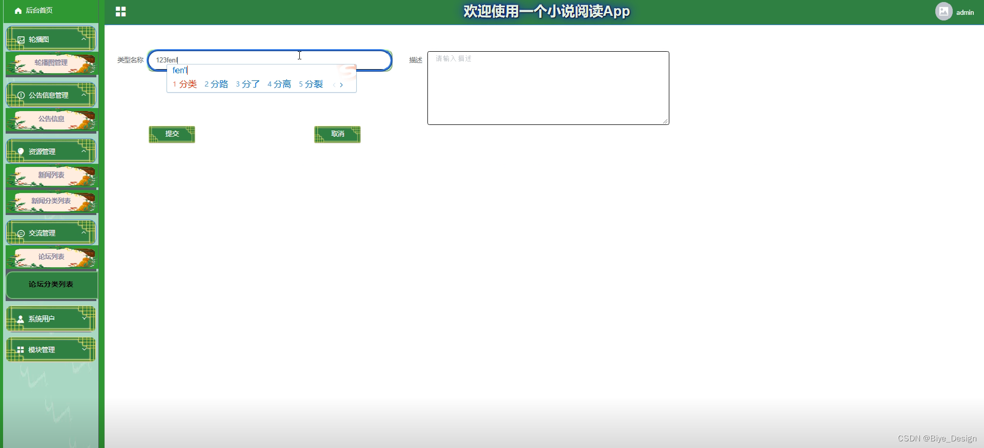 | 小说分类管理 (添加,修改,删除) | 输入正确信息 | 成功完成 |