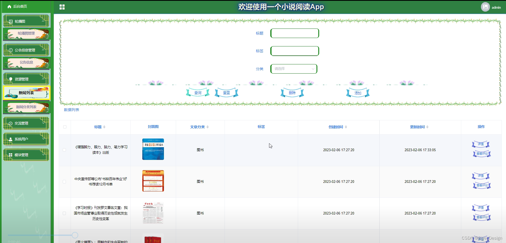本文研究的小说阅读APP完善了对应的软体架设以及程序编码的工作,采取Mysql作为后台数据的主要存储单元,采用Springboot框架、JSP技术、Ajax技术进行业务系统的编码及其开发,实现了本系统的全部功能。同时完成小说阅读APP的基本功能:小说浏览、留言反馈、交流论坛、小说信息、小说分类、评价小说、小说发布等。