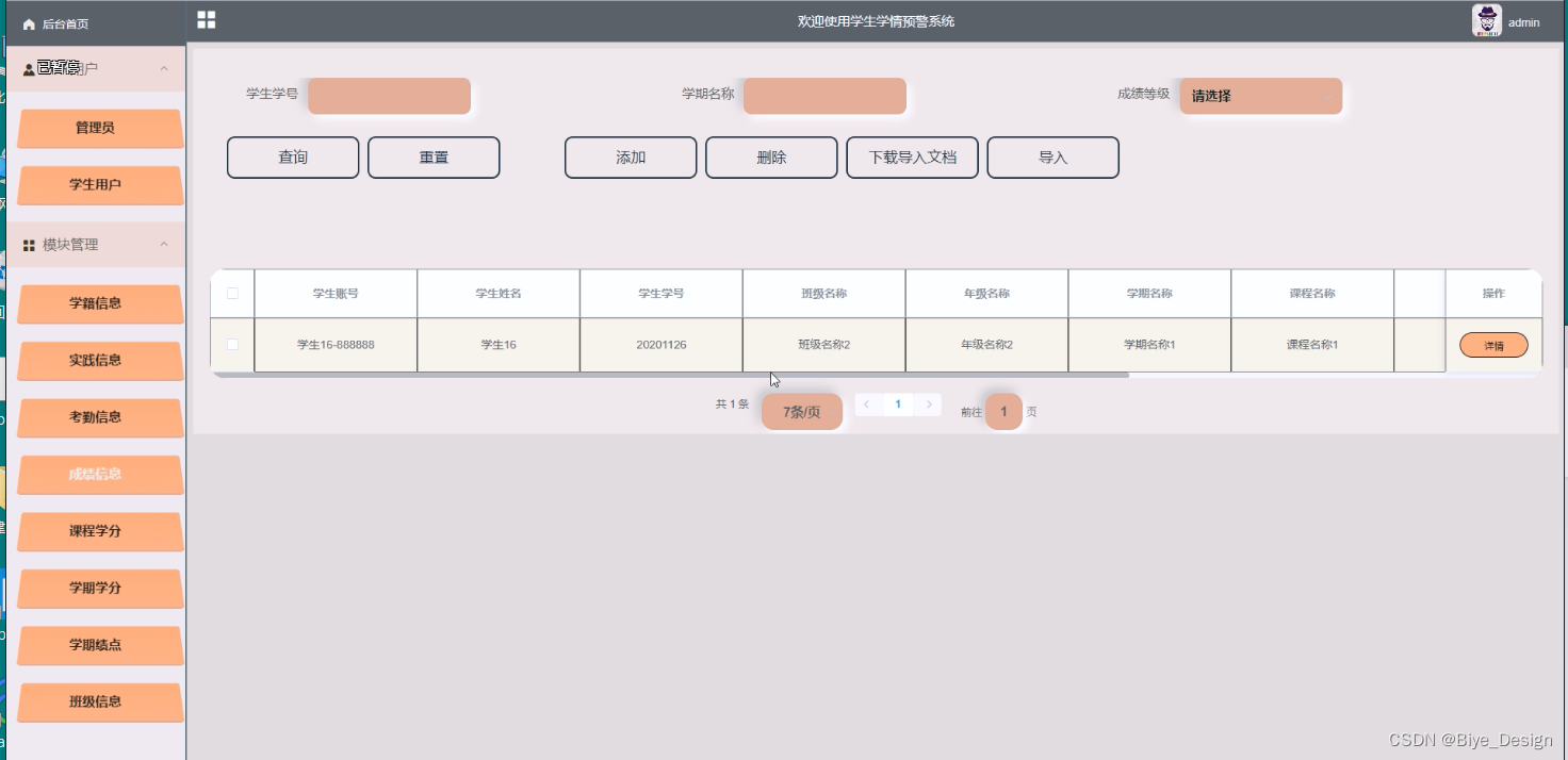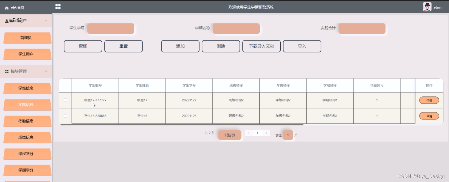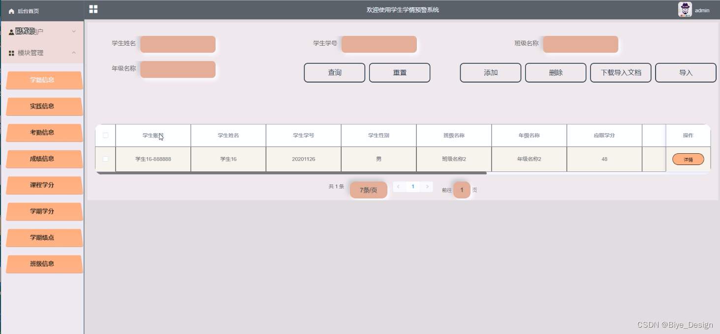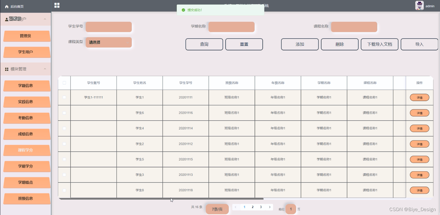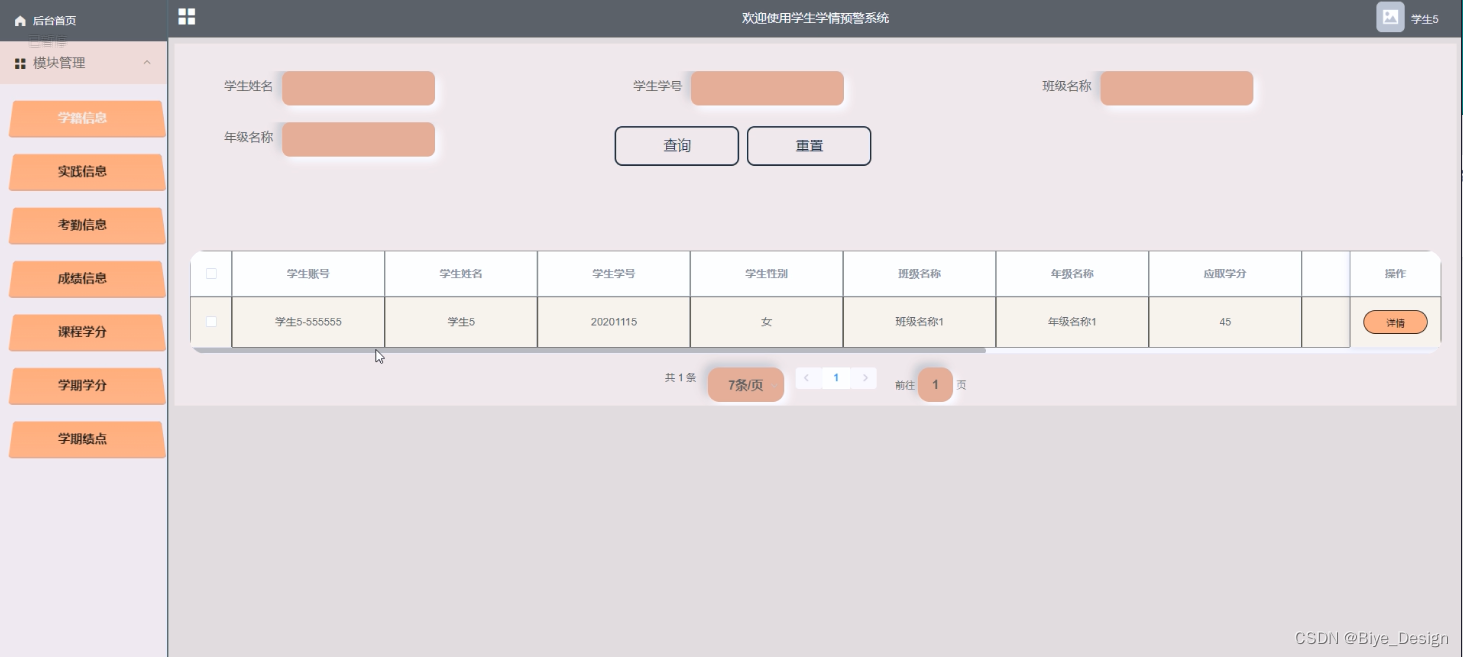 (1)功能要求:可以管理首页、系统用户、学籍信息、实践信息、考勤信息、成绩信息、课程学分、学期学分、学期绩点、班级信息等功能模块。