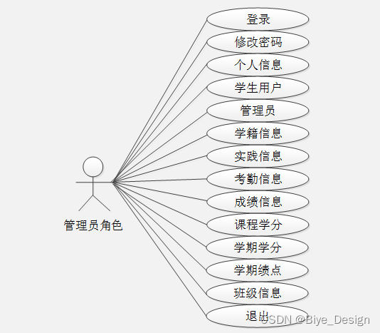 对于管理员可以使用的功能模块主要是系统用户、学籍信息、实践信息、考勤信息、成绩信息、课程学分、学期学分、学期绩点、班级信息等功能。
