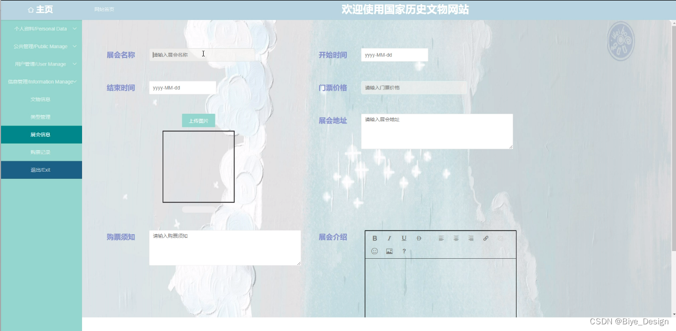 用户前台;首页、交流论坛、公告信息、新闻资讯、文物信息、展会信息、购票记录、我的等功能模块。