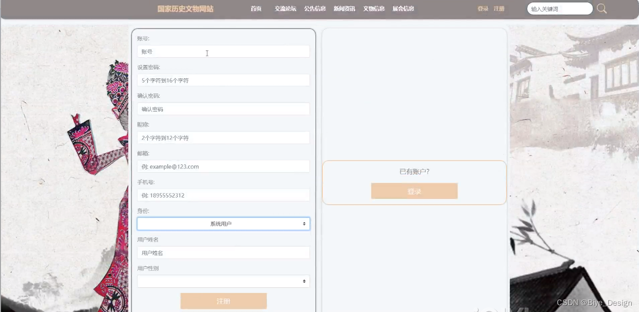 通过填写账号、设置密码、确认密码、昵称、邮箱、手机号、身份、用户性别、用户姓名等信息进行注册,输入完成后选择注册、登陆即可进入国家历史文物网站,如图5-7所示。