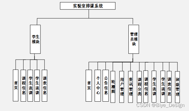 实验室排课系统在系统的平台上可以运行,主要实现了管理员后端;首页、个人资料、公共管理(轮播图、公告)用户管理(管理员、学生)信息管理(校园资讯、资讯分类)课程分类、课程信息、学生选课、学生退课、课表信息、班级管理;学生用户功能;课程信息、学生选课、学生退课、课表信息等;总体分布如图3.1所示: